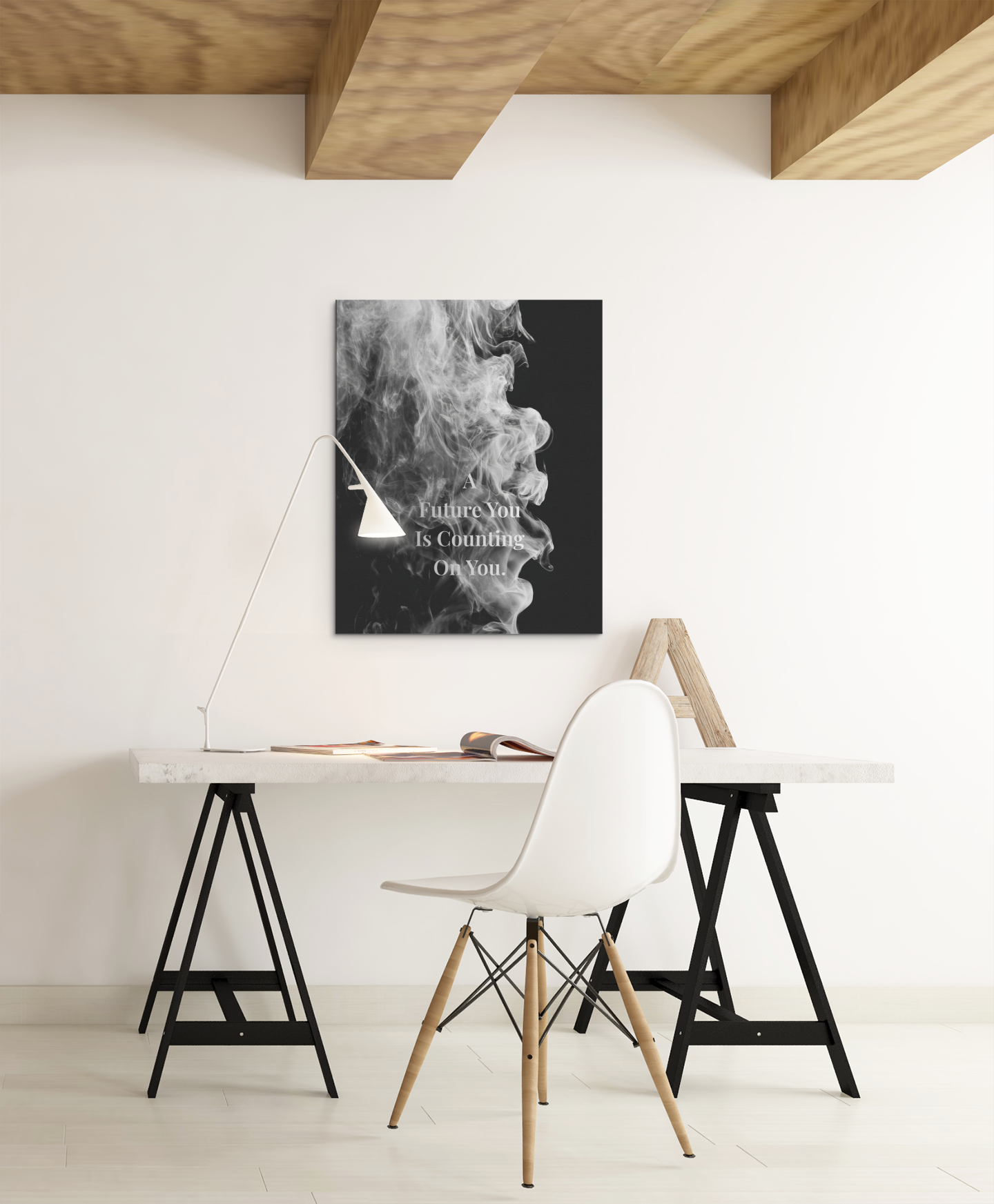 Bring powerful momentum to your space with this motivational print featuring the quote, “A Future You Is Counting On You.” Designed in a bold minimalist style with a soft smoke background, this piece adds intensity, purpose, and clarity to any room, perfect for gyms, offices, or anyone committed to becoming their best self.