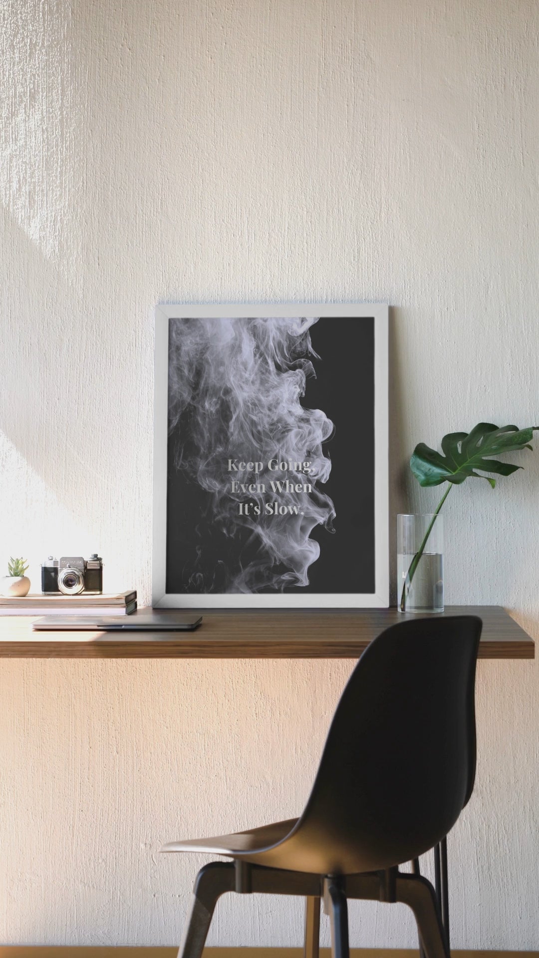 Our “Keep Going. Even When It’s Slow.” poster is a powerful reminder that progress does not always announce itself. Designed in our signature Smoke Edition style, this print brings depth, calm focus, and quiet determination to any space. Ideal for home offices, gyms, or reflective environments, it encourages patience, consistency, and trust in the process even when results feel distant.