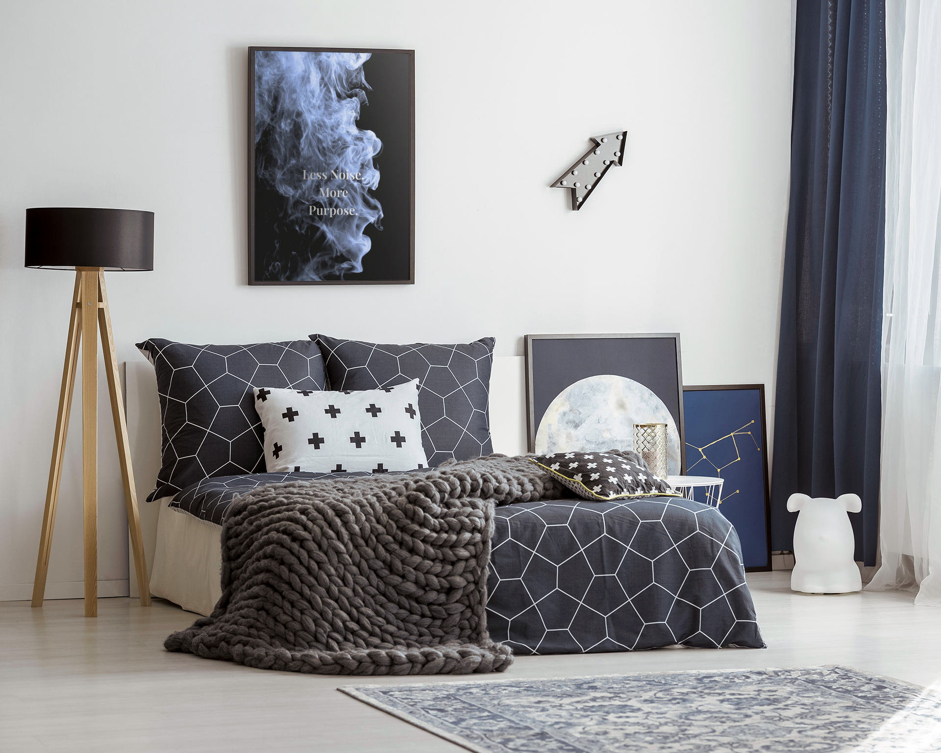 Our “Less Noise. More Purpose.” poster is a reminder to strip away distractions and focus on what truly matters. Designed in our signature Smoke Edition style, this print brings clarity, calm, and intention to any space. Ideal for home offices, creative studios, or minimalist interiors, it encourages focused thinking, mindful choices, and purposeful action.