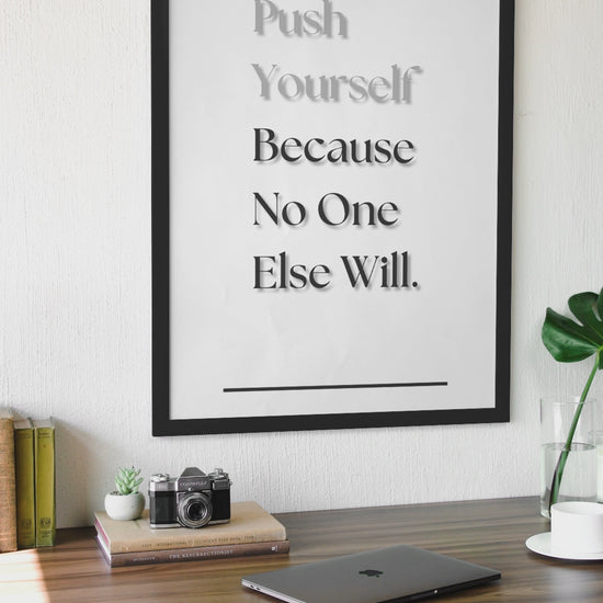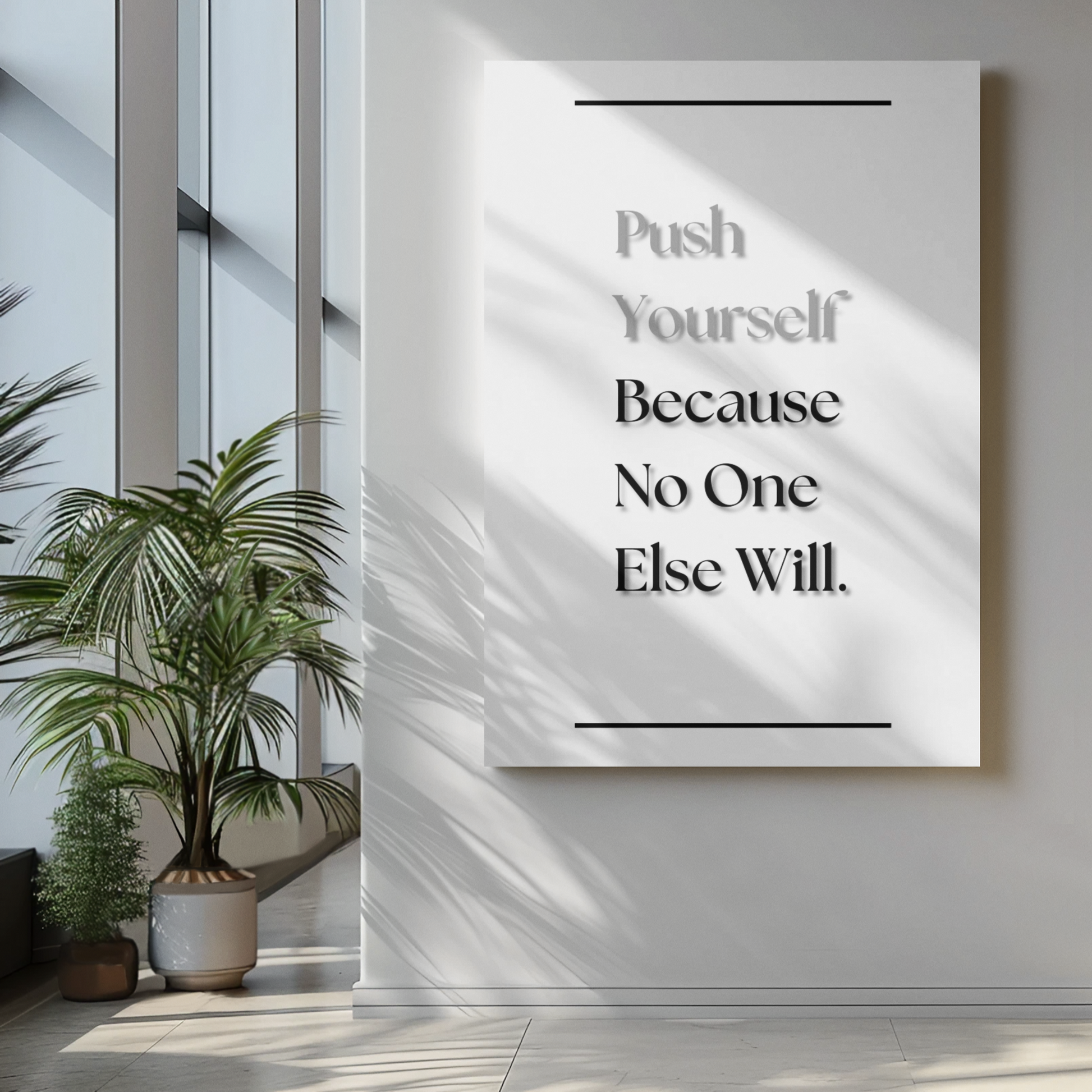 Inspire your day with this powerful motivational wall art featuring the quote “Push Yourself, Because No One Else Will.” Perfect for any gym, home office, or creative workspace, this minimalist design blends modern style with a message of resilience and self belief.