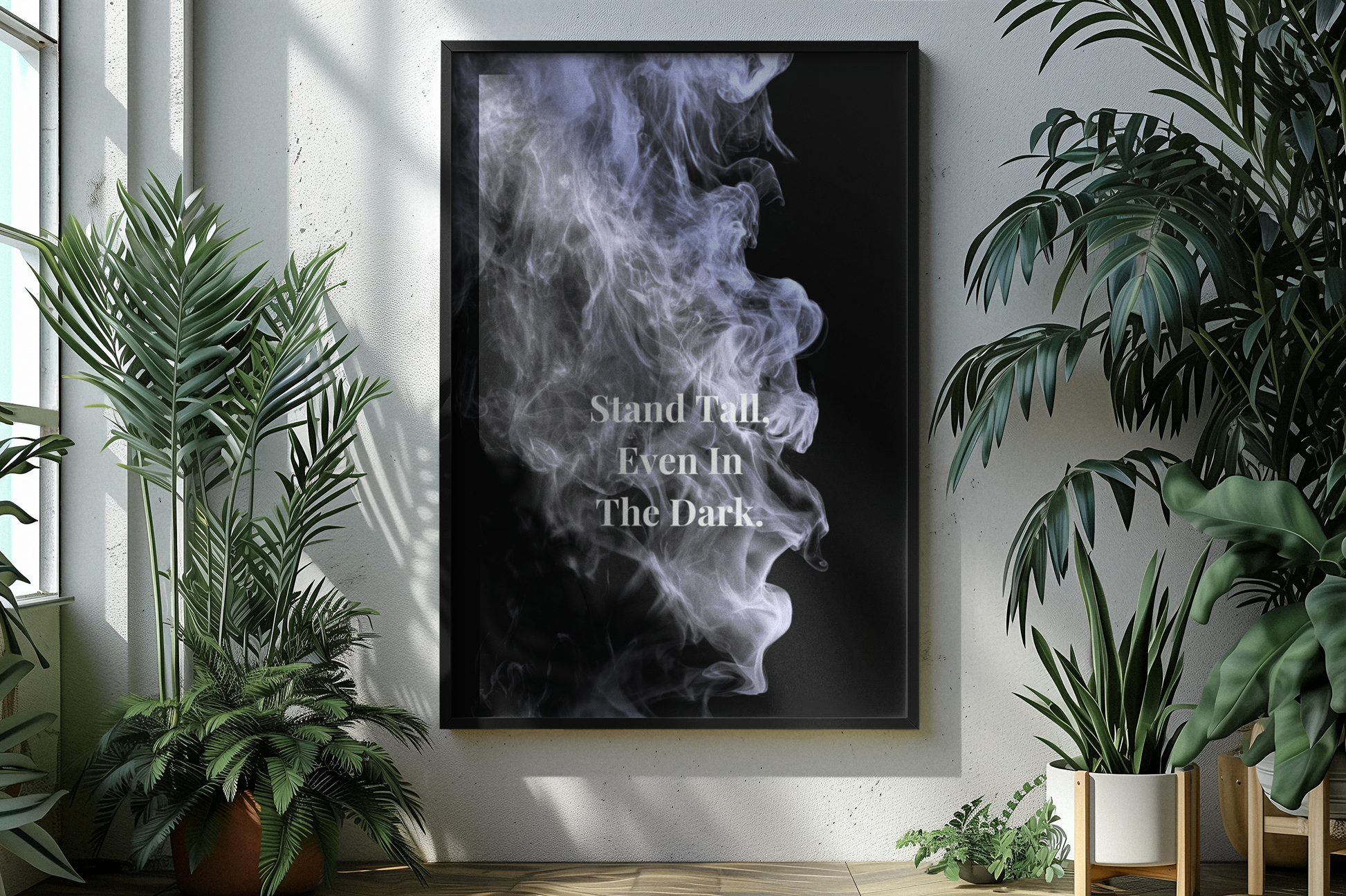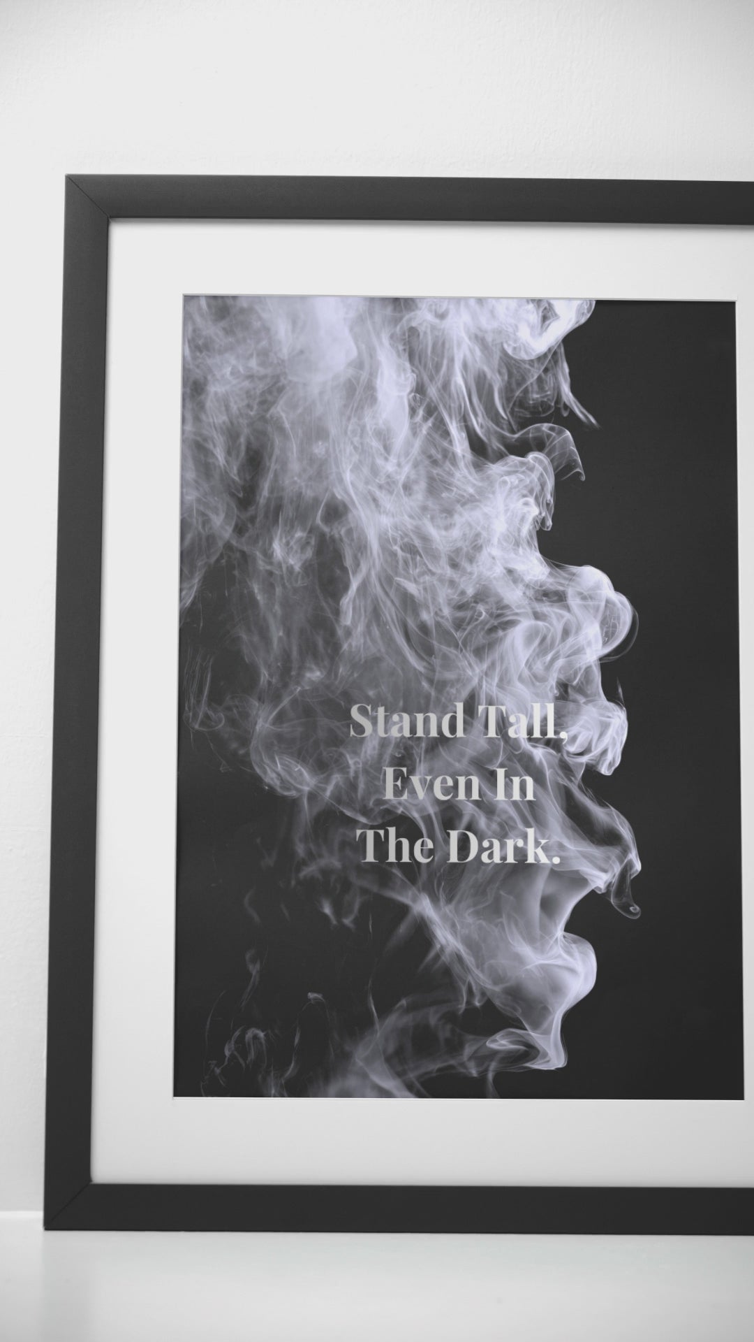Our “Stand Tall, Even In The Dark.” poster is a reminder to remain grounded and confident during uncertain moments. Designed in our signature Smoke Edition style, this print brings depth, calm strength, and reassurance to any space. Ideal for home offices, bedrooms, or reflective environments, it encourages resilience, composure, and steady presence even when clarity feels distant.